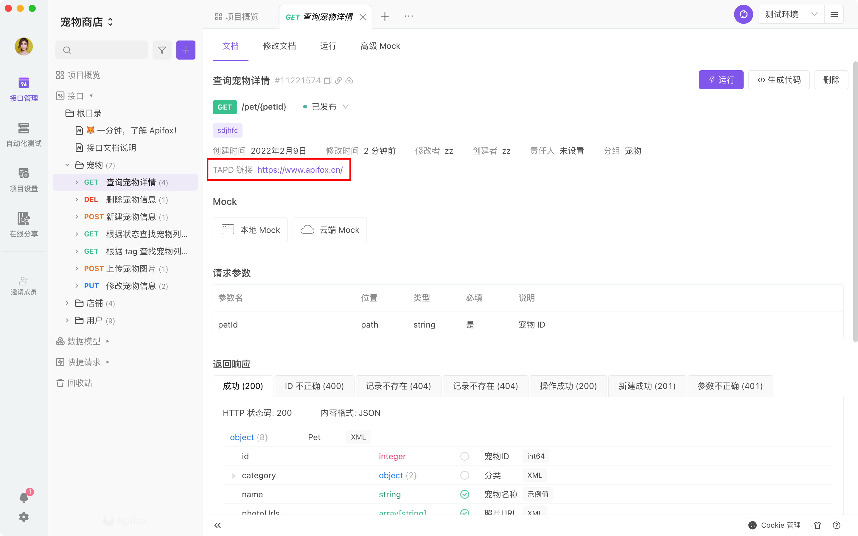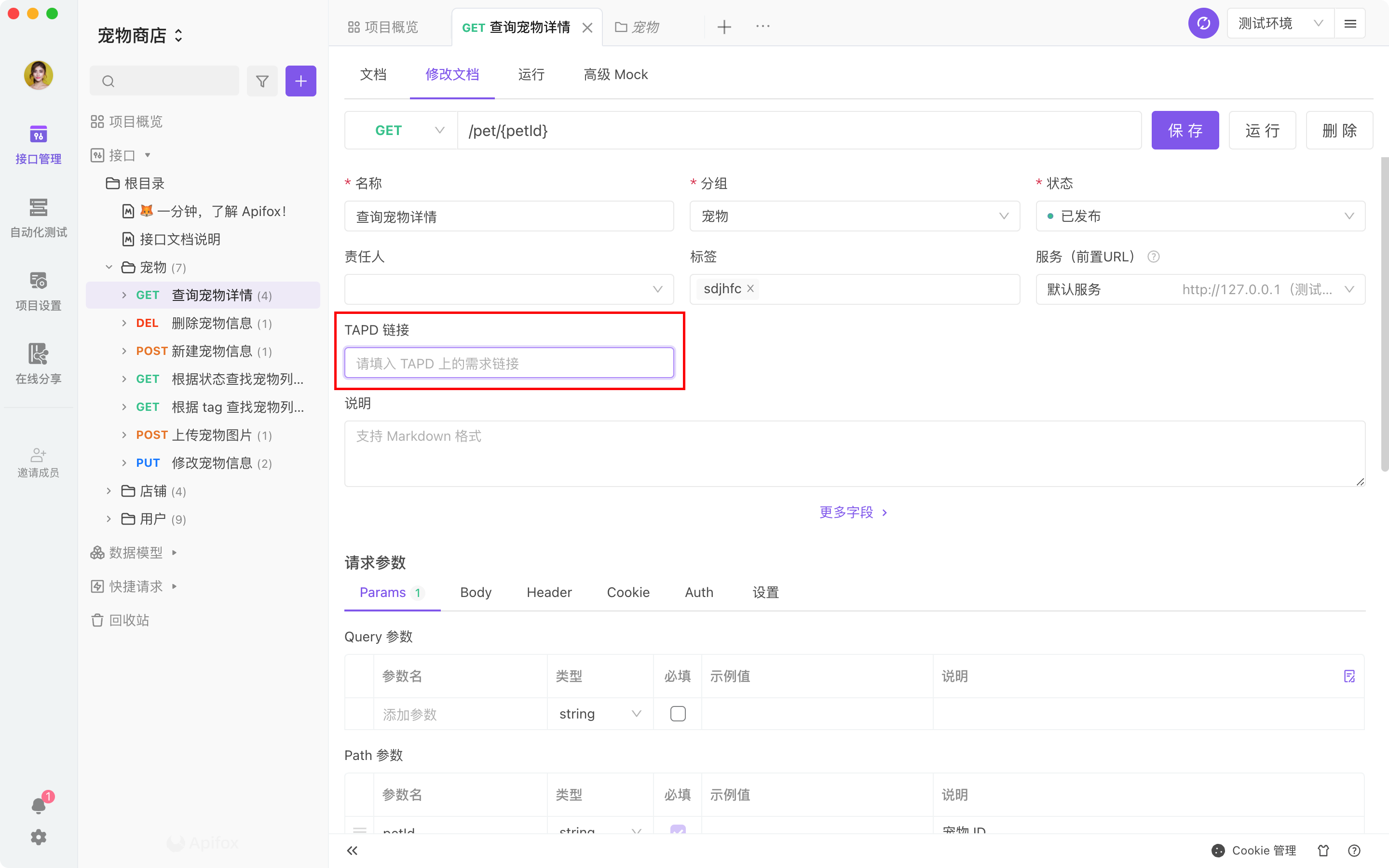 ”自定义字段“功能允许用户根据自己的需要,在接口文档中新增通用字段,比如:创建时间、TAPD 链接、需求文档链接等,以更加方便的管理项目。