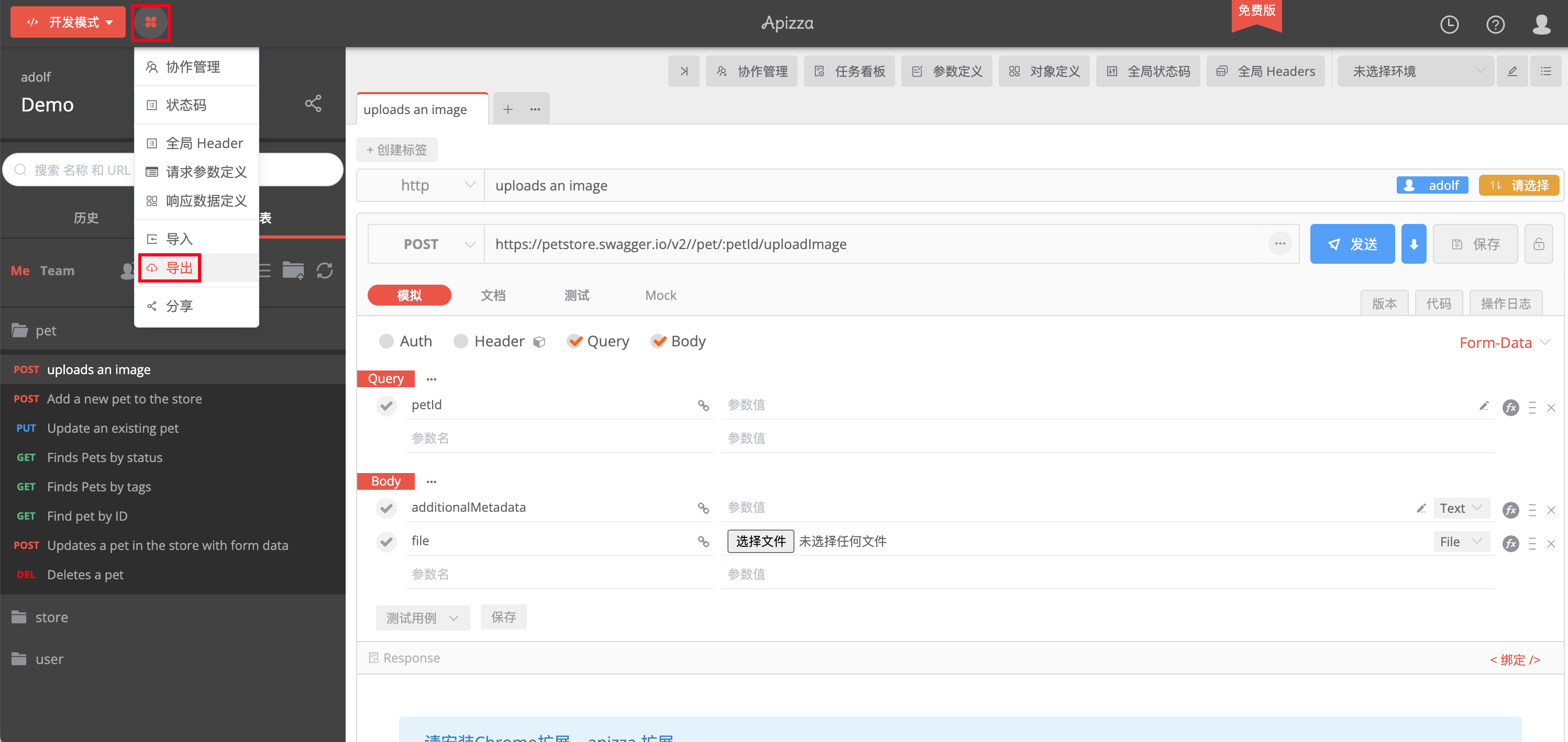 导入 / 导出接口导入接口导入 Apizza本页总览导入 Apizza支持导入 Apizza 中的 json 文件,有关于 Apizza 产品的详情说明请参考项目地址。导出数据访问 Apizza,在“开发模式”下,点击右侧的“圆形花状”按钮,轻点菜单下拉栏的“导出”选项。选择导出为 json 格式。导入数据打开 Apifox 中的“项目设置”面板,选择 Apizza,上传已导出的 json 文件。