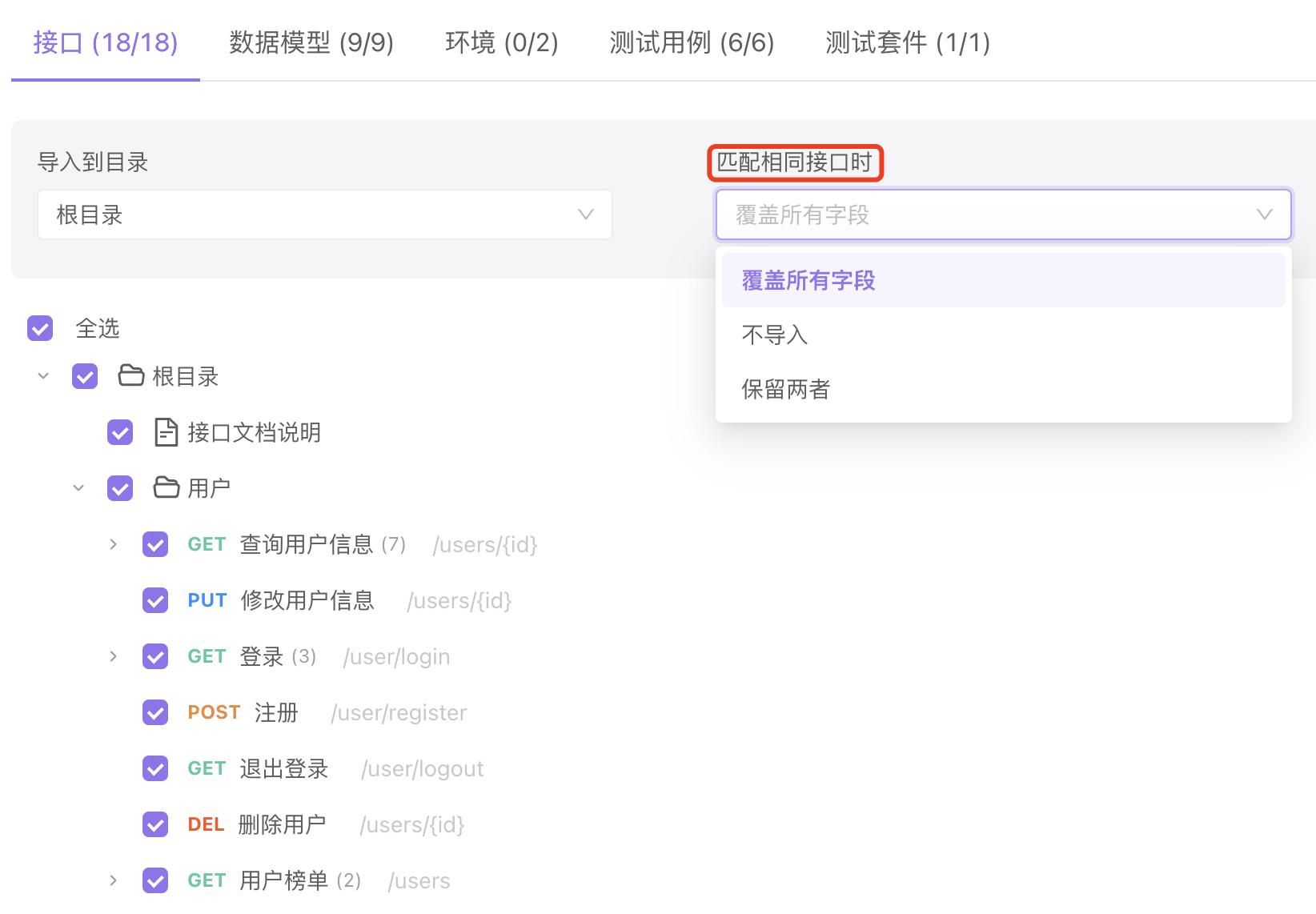 保留两者:当两个接口的接口唯一标识相同时,新文件会导入,旧文件不会被删除