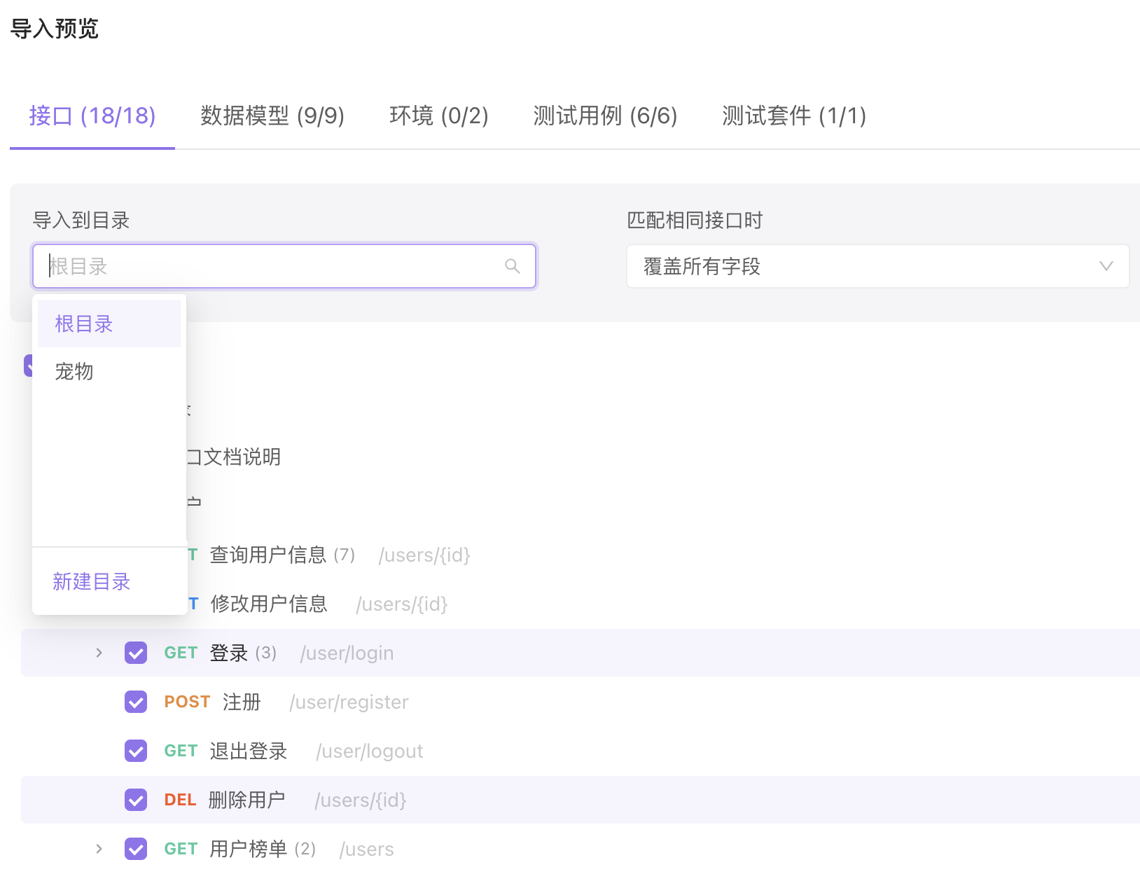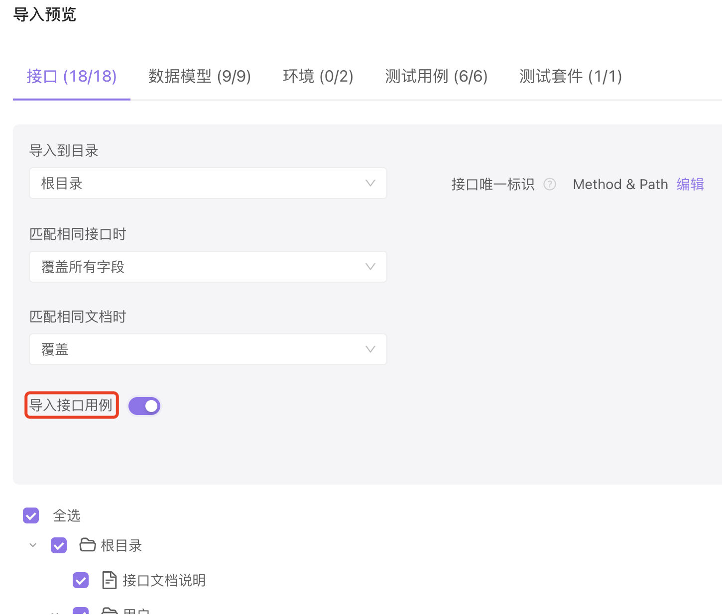 当导入非 Apifox 格式文件,且接口文档覆盖时,名称相同的