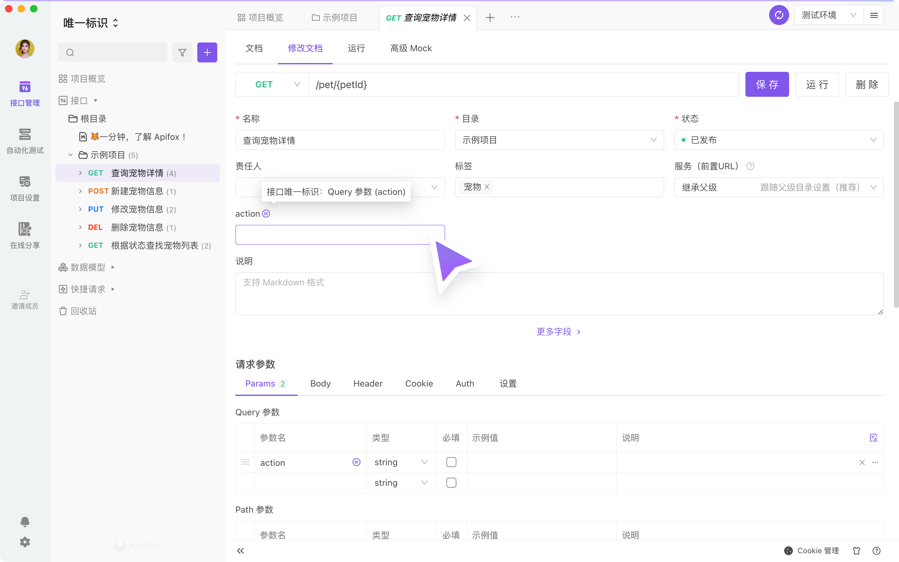 举例:某一个电商 API 接口,以 Query 参数 的参数 action ,作为 接口唯一标识 的参数。在下图选择为 Query 参数 后,在其右侧的输入框中输入对应的参数名。