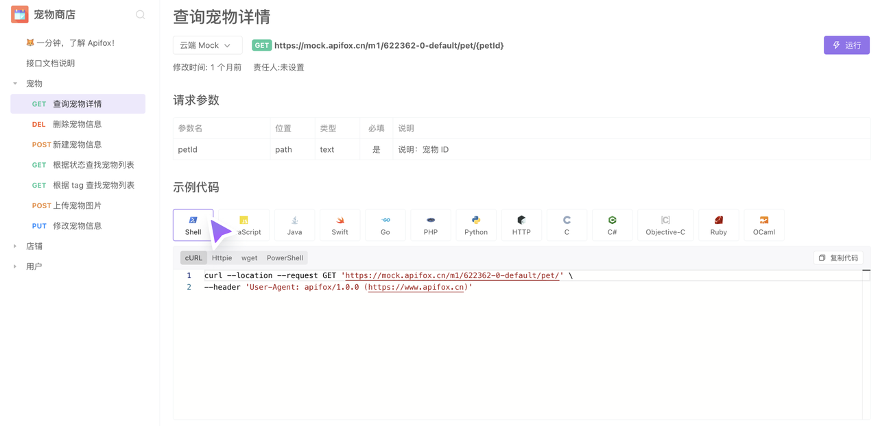 - 运行环境:可以选择运行的环境,和显示对应的前置 URL。选择后,分享出去的在线接口文档支持运行调试