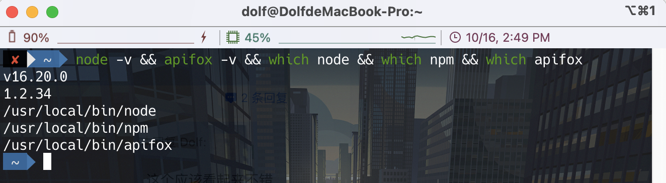 node -v && apifox -v && which node && which npm && which apifox