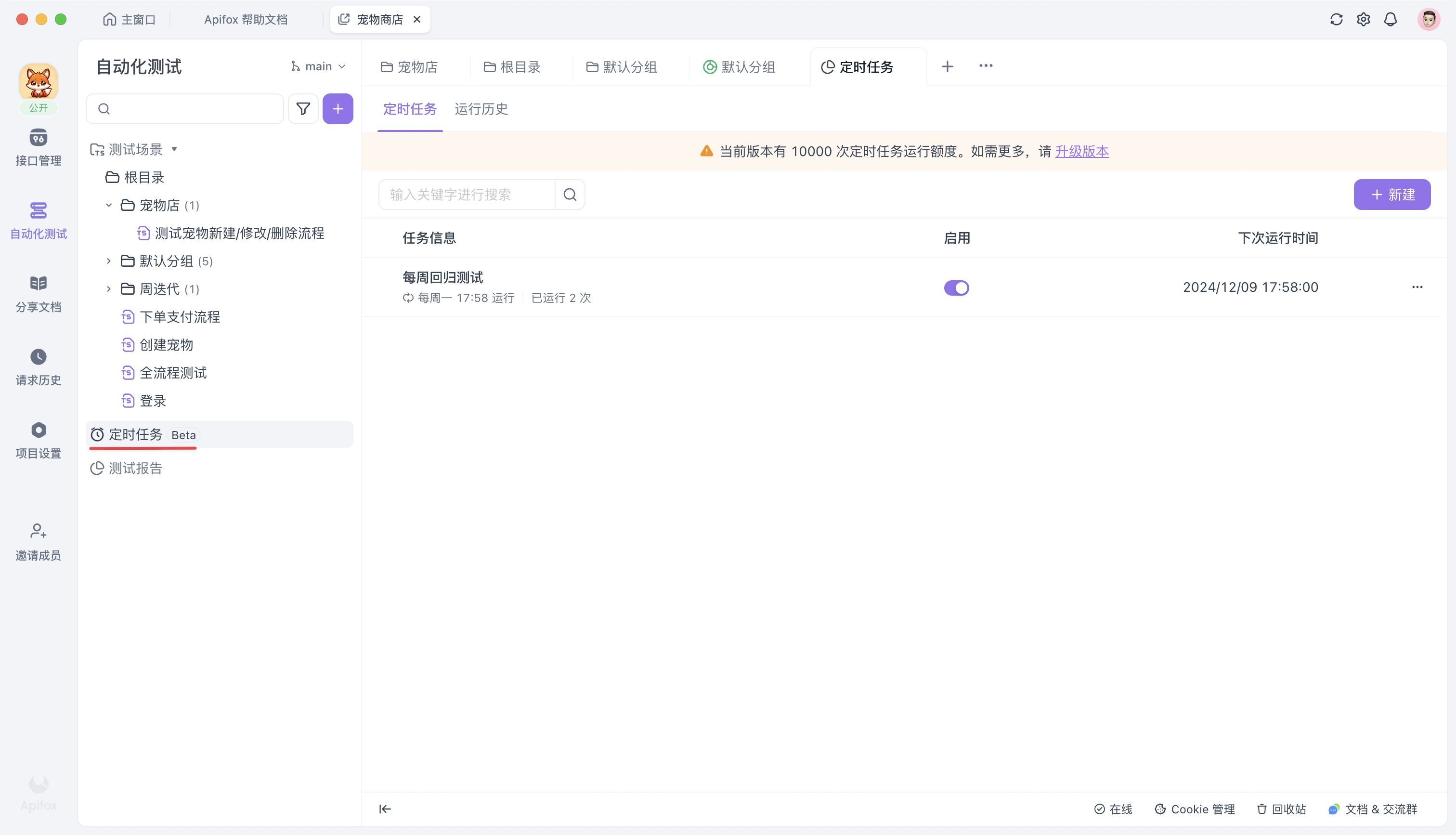 在自动化测试的目录树下方,可以看到“定时任务”。点击进入定时任务列表,你可以对当前项目的全部任务进行查看/管理,列表上包含一些重要信息:
