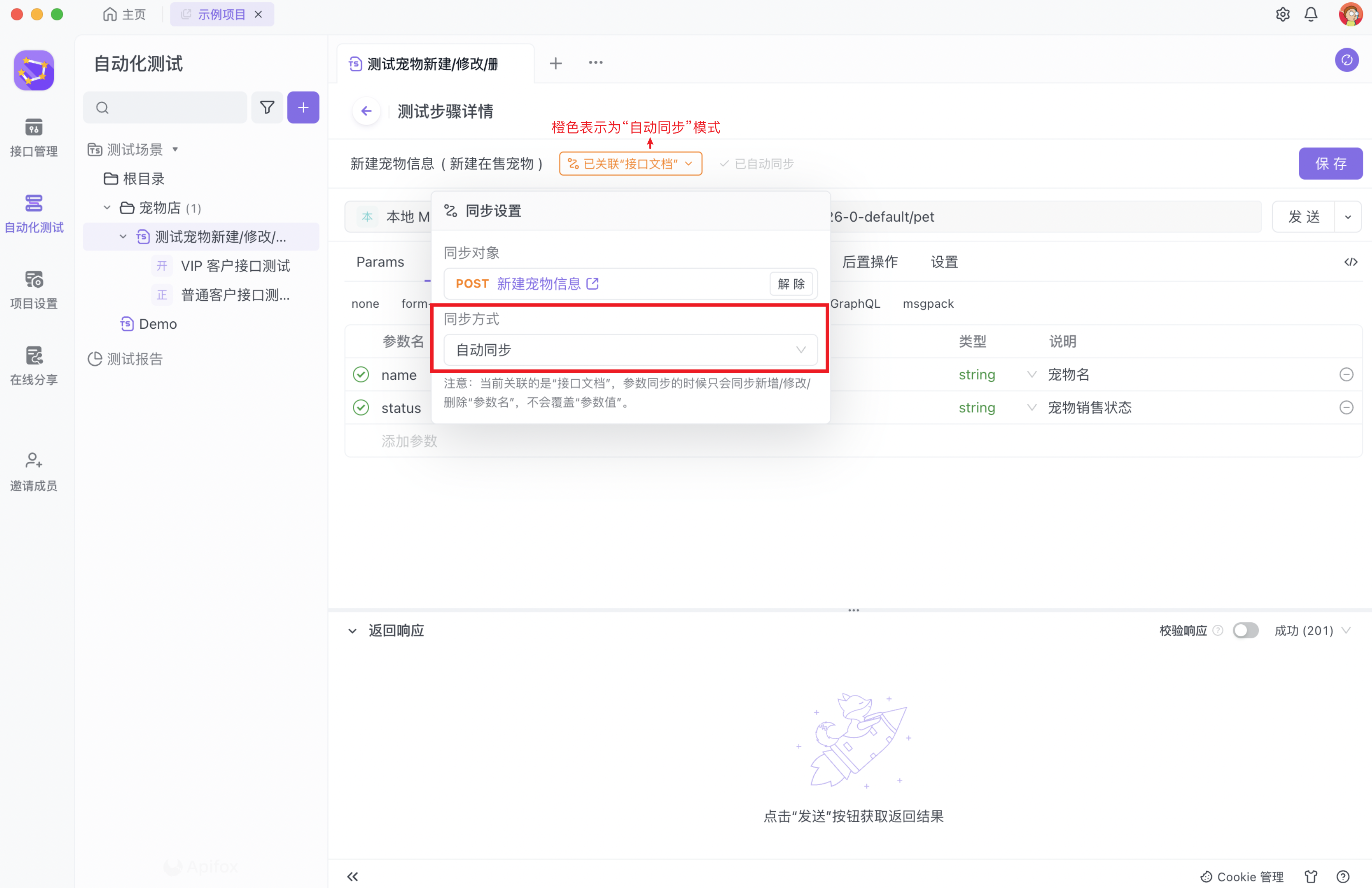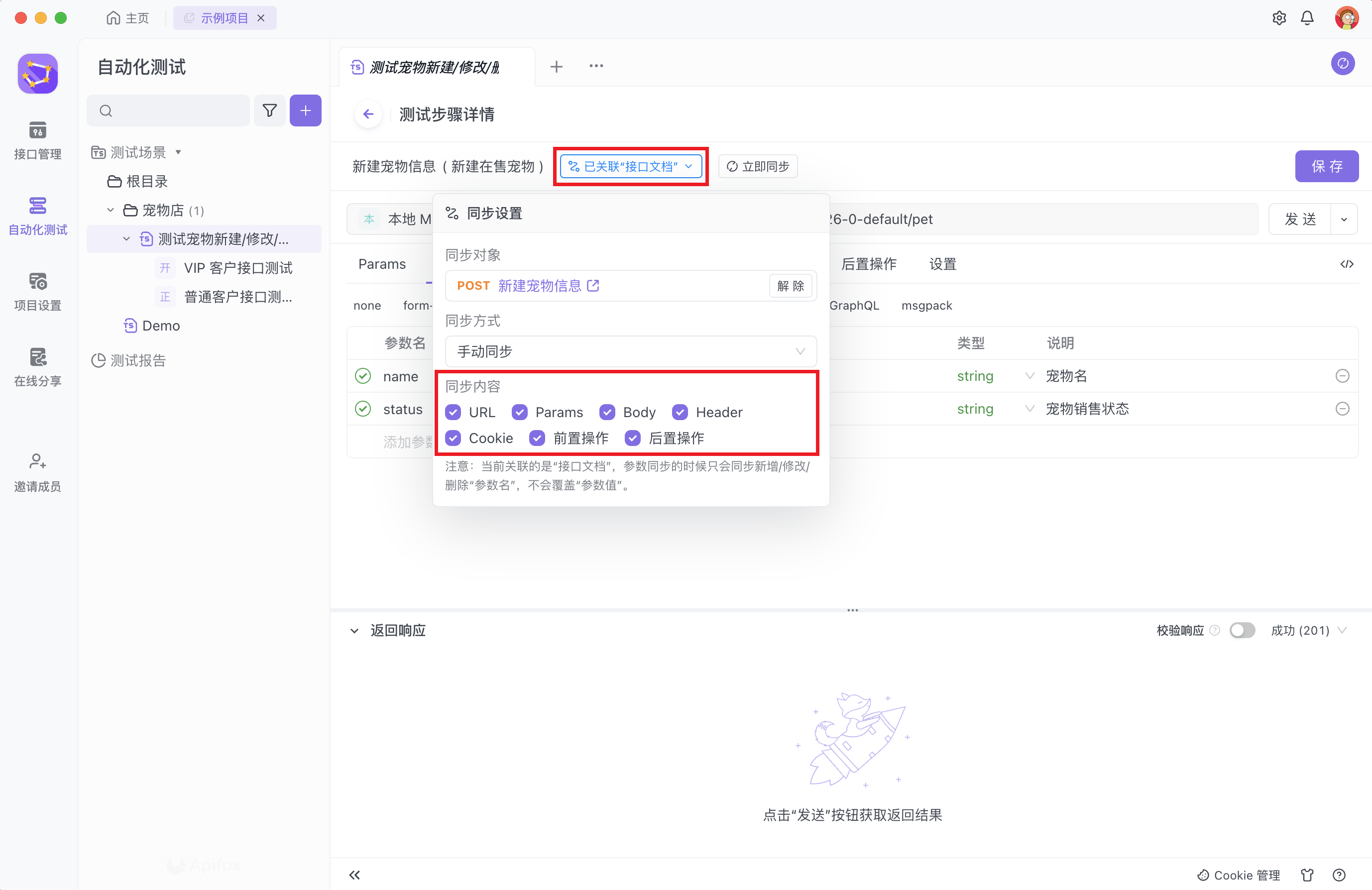 自动同步模式适合小团队或独立开发者场景,即一个项目中的接口定义、研发、测试流程均由一个角色负责,提升接口维护与测试的效率。当「接口管理」中的接口文档/用例发生变动时,测试步骤中的接口文档/用例数据也将联动调整,确保「接口管理」和「自动化测试」中的数据相一致。