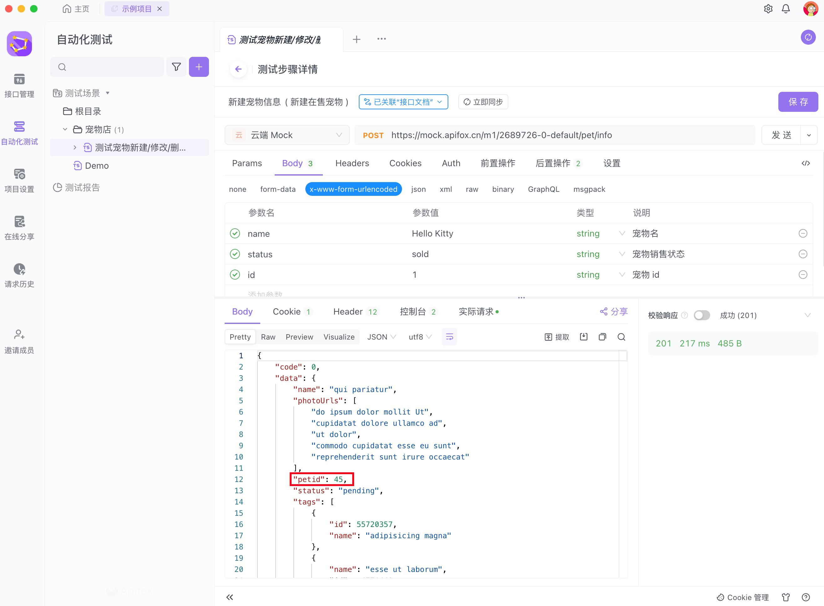 选择从 A 接口 的响应数据 Body 中提取信息,指定“提取部分”数据。可以在 A 接口的请求响应中看到目标 petId 参数值位于 data 列中。