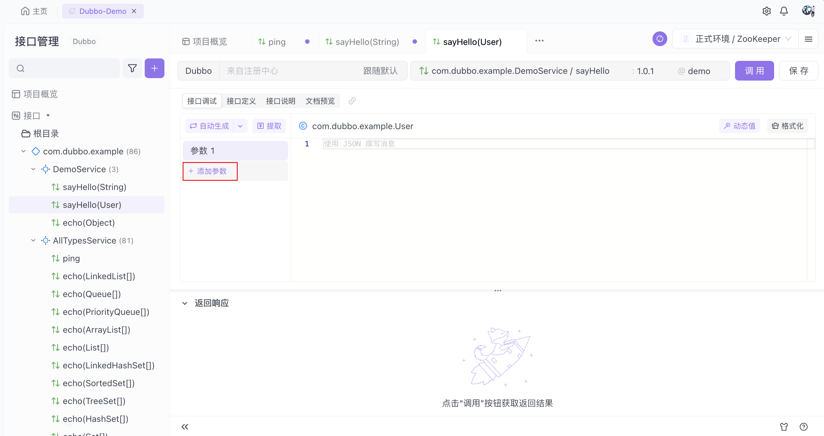 在右上角指定刚刚配置的服务器地址,项目内的其它 Dubbo 接口也将会默认采用该地址。