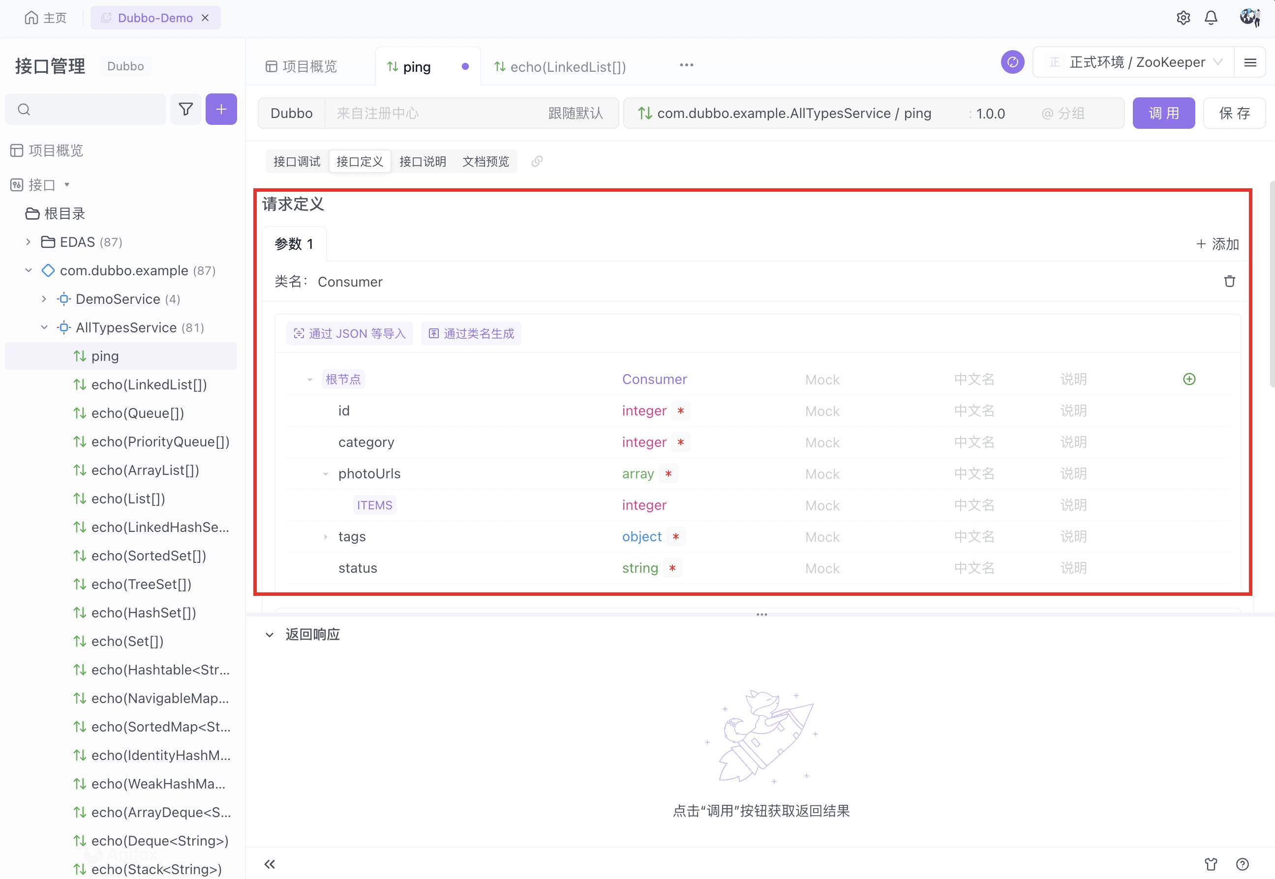 开始调试接口前需定义目标服务器地址,你可以通过直连服务器或通过注册中心两种方式进行调试。