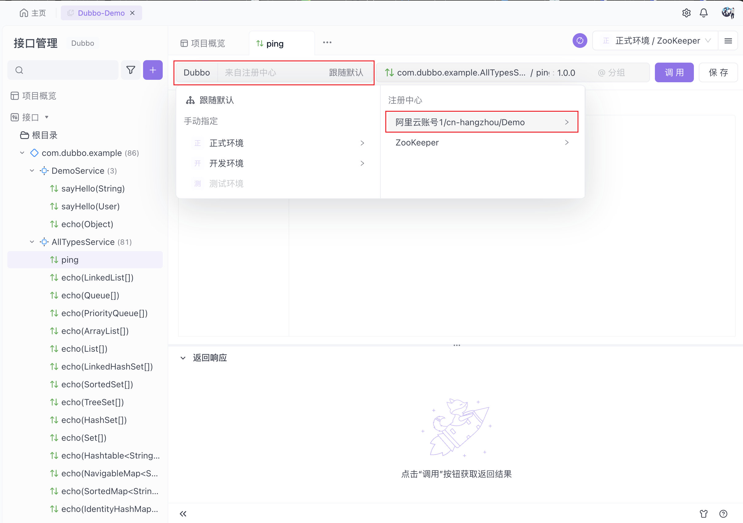 在右上角指定刚刚配置的注册中心,项目内的其它 Dubbo 接口也将会默认采用该注册中心地址。