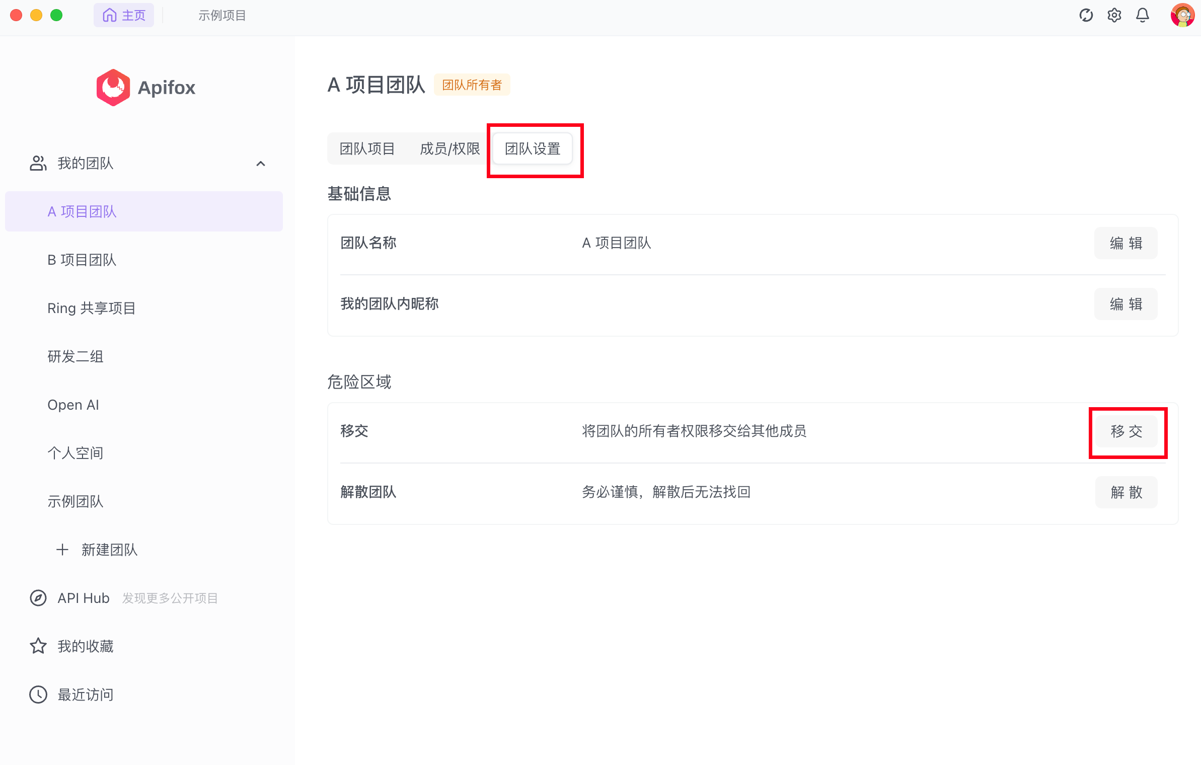 团队所有者可通过「团队设置」->「危险区域」->「移交」,移交给团队其他成员。